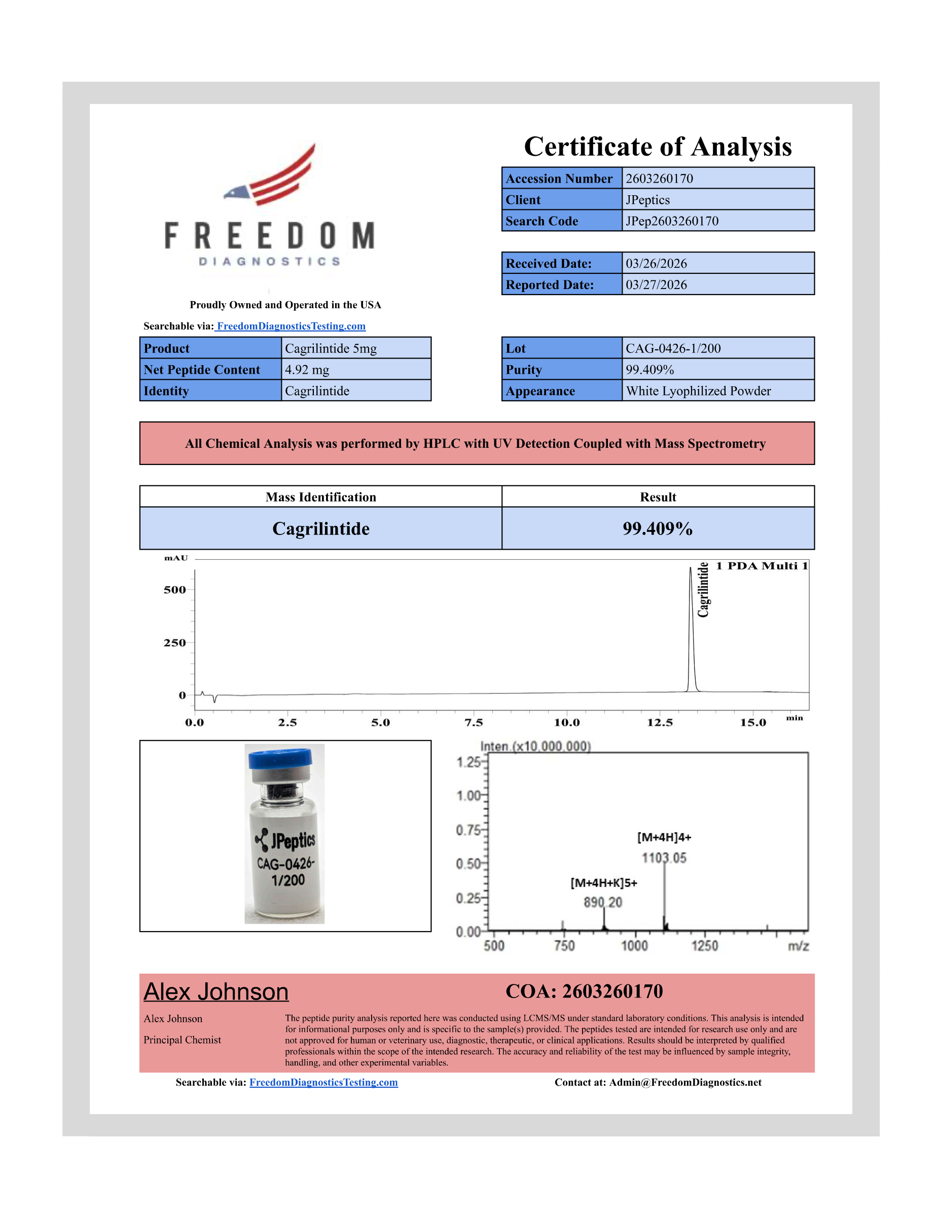 Each batch of Cagrilintide comes with a complete Certificate of Analysis showing: